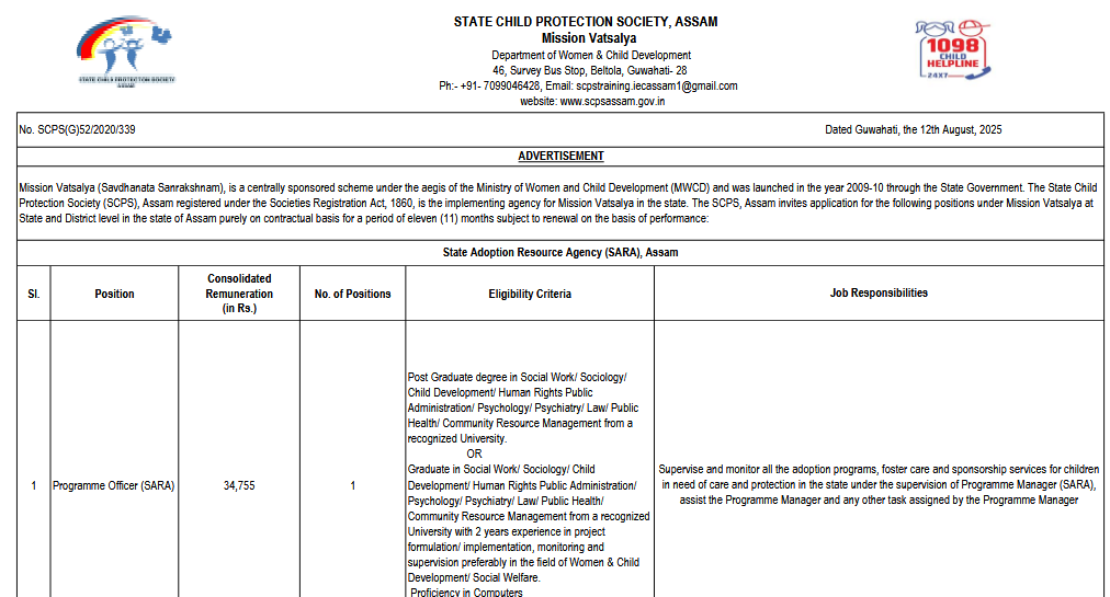 The State Child Protection Society (SCPS), Assam, under the Mission Vatsalya scheme of the Ministry of Women and Child Development, has announced a major recruitment drive for 237 contractual positions. The vacancies are spread across State, District, and Child Care Institution (CCI) levels and will be purely on a contractual basis for 11 months, with the possibility of renewal based on performance.
